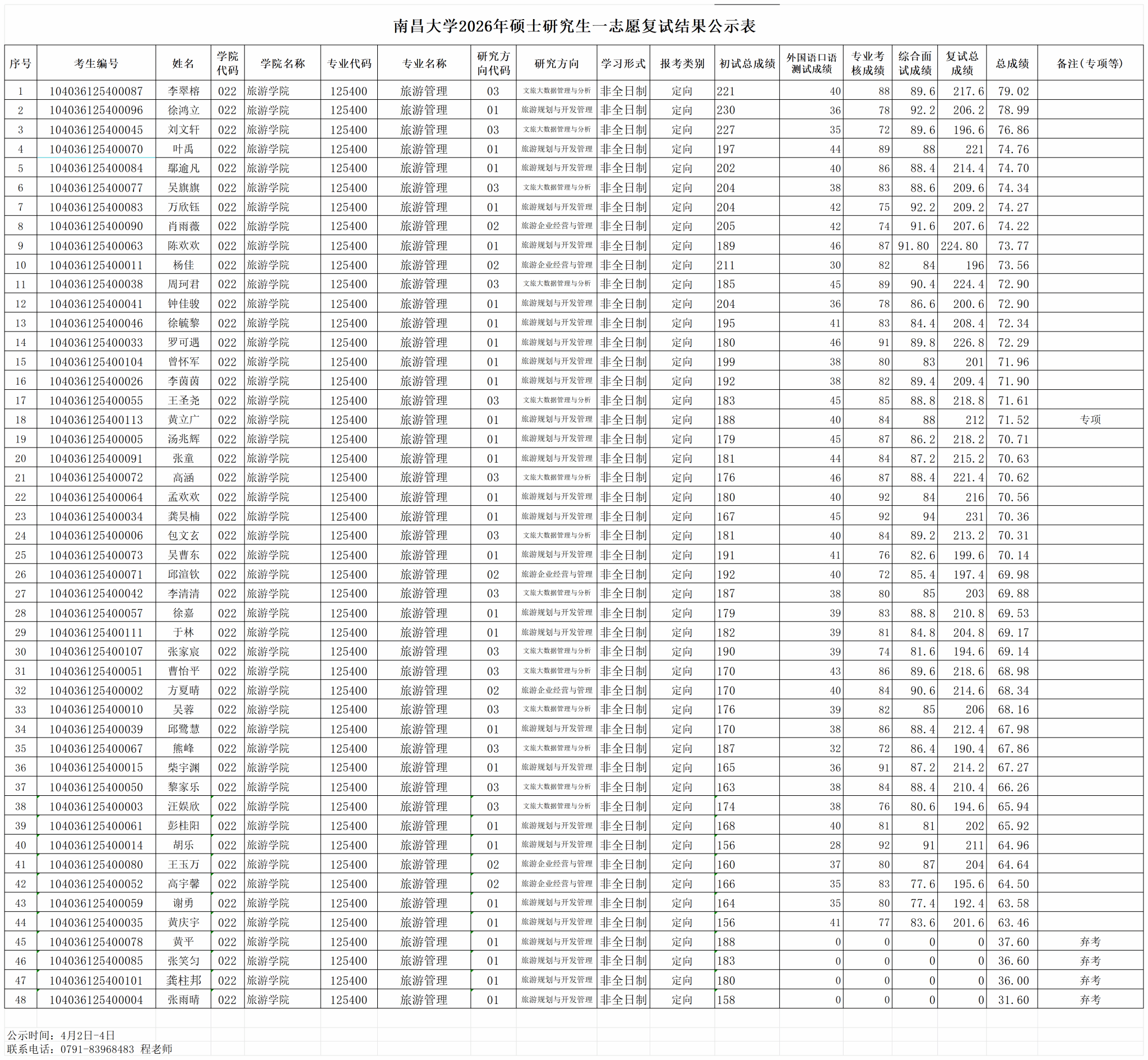 旅游学院研究生一志愿考生复试成绩公示如下,如有异议,请联系: 0791-83968483程老师,联系邮箱:lyxy@ncu.edu.cn。